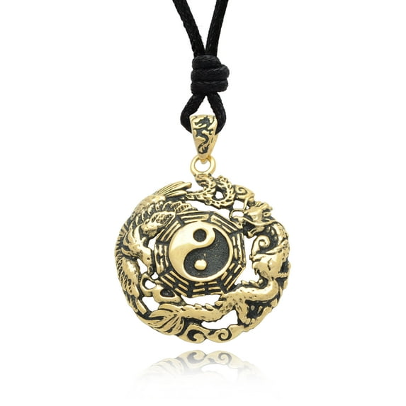 Phoenix Dragon Yin Yang Handmade Brass Charm Necklace Pendant Jewelry With Cotton Cord