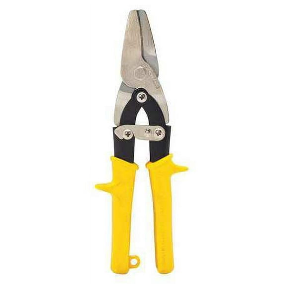 All Purpose Snip, Cutting Action Left/Right/Straight, Overall Length 9 In., Metal Gauge 22 Cold Rolled Steel/26 Stainless Steel, Cutting Edge Serrated, Cutting Length 1-1/4 In., Handle Color Yellow, Safety Latch Yes, Handle Design Ergonomic Cushion Grip, Material Manganese, Features Bi-Material Grip, Serrated Blades