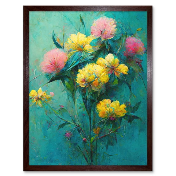 Hero image 0 of Pink And Yellow Flower Bouquet In Teal Oil Painting Art Print Framed Poster Wall Decor 12x16 inch, 0 of 5