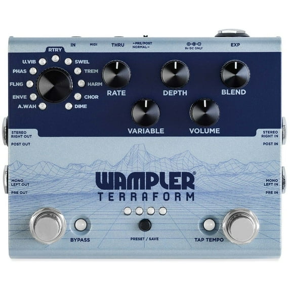 When Wampler decides to jump into the multiFX market, they do it in style. 11 custom designed effects blocks, from Flanger to Phaser, Chorus to U-Vibe, Harmonic Tremolo to Envelope Filter, you know everything about it is going to be perfect. In one incredibly small package, you can control any of the 8 presets via MIDI, you can assign an expression pedal to control ANY of the main five controls, you can run it in full glorious stereo or keep it in mono... you can even split that mono signal to route some effects to go before your drive pedals, or amp gain, and have the rest follow behind or in your effects loop! When you put the Terraform into your rig, you know that not only will you get that legendary Wampler tone, but you will get the most easy to use, hugely versatile and best sounding collection of modulations you could ever want!