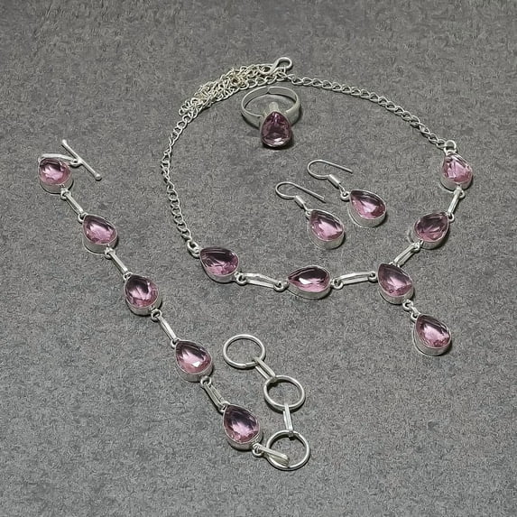 Pink Kunzite Gemstone Necklace Set Handmade Antique Design Pear Shape Jewelry