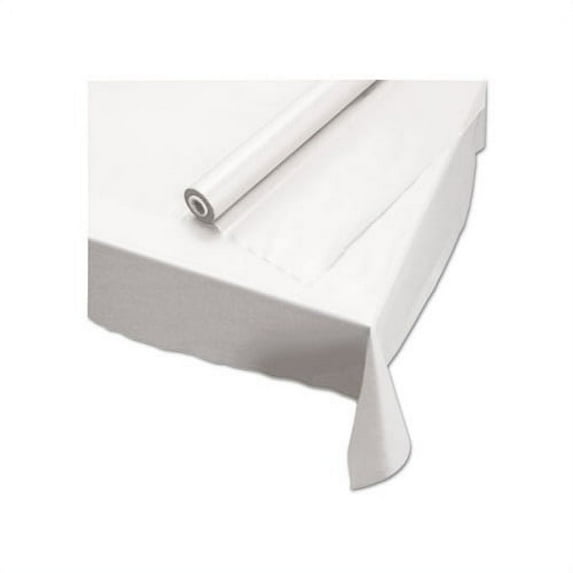Adds style to any special event. Plastic tablecover protects surface from spills and drops. Cut to fit table length. Shape: Rectangular Materials: Plastic Colors: White Width: 40".