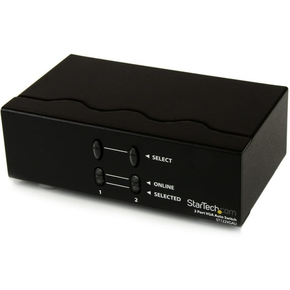 The ST122VGAU VGA Auto Switcher lets you share a display between two computers and prioritize your VGA signals. The VGA switch features a primary and secondary VGA input port, and automatically outputs the signal from the primary input. When the signal feed connected to the primary input port is cut, the switcher automatically defaults to the video signal on the secondary VGA input port.