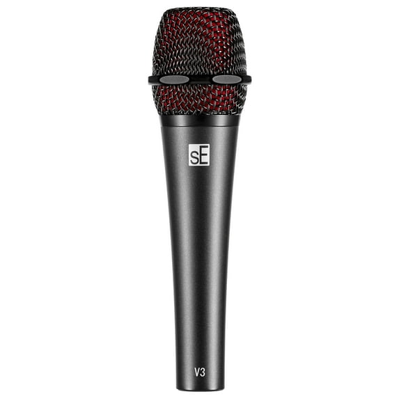 V3 Dynamic Microphone. The V3's road-ready design features a highly durable zinc alloy chassis designed to hold up under onstage stress, and the spring steel mesh grille is dent-proof and corrosion-free. Also, that beveled edge around the grille prevents your mic from rolling around when you put it down on top of your amp or the stage floor. Nice! The V3's gold-plated XLR connector also ensures a loss-free and reliable signal connection for years to come. Its internal windscreen efficiently reduces unwanted wind noise and plosive pops and just in case you don't like the stylish "sE Red" color, a spare black windscreen is included. The dynamic element in the V3 has been custom-developed for a smooth, natural sound on any voice or instrument - and its cardioid capsule design helps efficiently isolate your voice from other on-stage sounds, ensuring plenty of gain before feedback. Proven Neodymium magnets, tight production tolerances & high-end workmanship ensure excellent sensitivity, superior sound quality and superb consistency. Integrated Shockmount The V3's brand new, patented shockmount efficiently decouples the capsule from mechanical vibration, providing exceptionally low handling noise as compared to other mics in its class. This means you can feel free to move around on stage without fear of rumbles, pops, or anything other than your voice coming through.