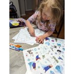 [This review was collected as part of a promotion.] Great closed set for travel. Has everything you need to fully use the kits, and the Pip-Squeak markers are adorable. 16 sheets of paper, with coloring images on one side and games (plus coloring opportunities) on the other. 3-year-old loves the stickers and coloring aspects. Young for the activities, definitely needs plenty of direction and assistance with them.