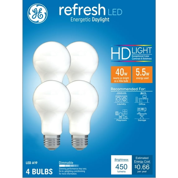 $1999current price $19.99GE 44899 Refresh 4-Pack 40 W Equivalent 5.5W Dimmable 5000k Daylight A19 LED Light Fixture Light Bulbs