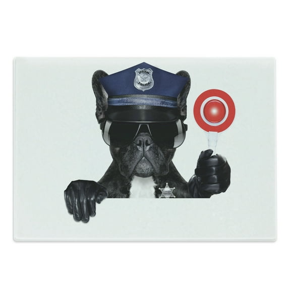 Hero image 0 of Police Cutting Board, Animal Dog Pug Wears Glasses Thumbs up Sirens Traffic Like Art Print, Decorative Tempered Glass Cutting and Serving Board, Large Size, Blue and Black, by Ambesonne, 0 of 1