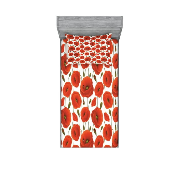 Hero image 0 of Poppy Flower Fitted Sheet & Pillow Sham Set, Springs Ladybugs Animals and Plants Flora Fauna Nature, Decorative Printed 4 Piece Bedding Decor Set, Twin, Orange Olive Green White, by Ambesonne, 0 of 3