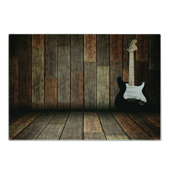 Hero image 0 of Popstar Party Cutting Board, Electric Guitar in the Wooden Room Country House Interior Music Theme, Decorative Tempered Glass Cutting and Serving Board, Small Size, Brown Black White, by Ambesonne, 0 of 1