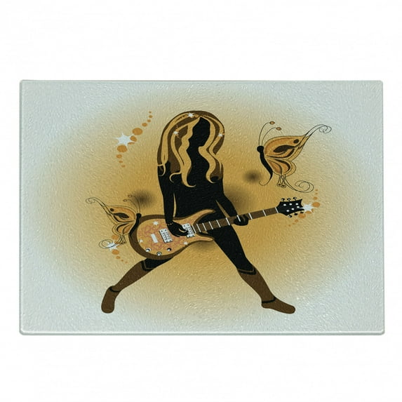 Hero image 0 of Popstar Party Cutting Board, Girl Silhouette with Hairstyle and Butterflies Playing Guitar, Decorative Tempered Glass Cutting and Serving Board, Small Size, Orange Brown Dark Brown, by Ambesonne, 0 of 1