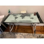 The World Map Computer Desk is the perfect addition to any office or work area. Crafted from strong chrome plated metal and durable glass, the top features a beautiful map design while the sides feature a unique X pattern. Providing ample work space and design features like no other, this piece is sure to become a conversation starter. Some assembly required.