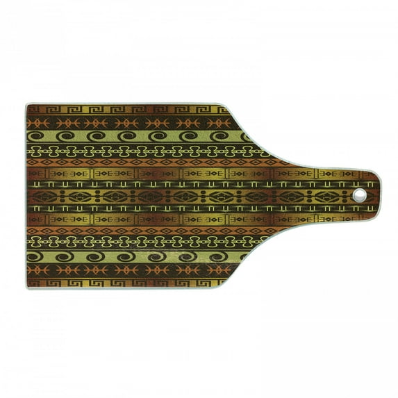 Prehistoric Cutting Board, Indigenous Geometric Motifs Ornament Traditional Tribal, Decorative Tempered Glass Cutting and Serving Board, Wine Bottle Shape, Brown Yellow Pale Orange, by AmbesonnePrehistoric Cutting Board Indigenous Geometric Motifs Ornament Traditional Tribal Decorative Tempered Glass Serving Wine Bottle Shape Brown Yellow PaPrehistoric Cutting Board Indigenous Geometric Motifs Ornament Traditional Tribal Decorative Tempered Glass Serving Small Size Brown Yellow Pale OranPrehistoric Cutting Board Indigenous Geometric Motifs Ornament Traditional Tribal Decorative Tempered Glass Serving Large Size Brown Yellow Pale Oran