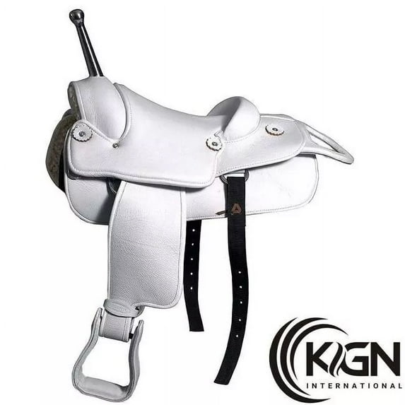 Elevate your riding experience with the KGN Leather Barrel Racing Horse Saddle in a stunning white color. Crafted with premium quality genuine cowhide skirting leather sourced from the best tanneries, this expertly handmade saddle features a hand-finished design and a specially made steel horn for trick riding. Offered by the renowned KGN International brand, one of the few companies that make authentic leather saddles at an affordable price, this saddle boasts a seat size range of 16 to 18 inches, making it suitable for adult users. Designed for a perfect grip and exceptional durability, this saddle is a must-have for any equestrian enthusiast.