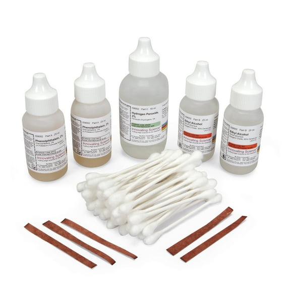 Perform the classic 3-step Kastle-Meyer test for blood using the premixed solutions in this convenient kit. In the test's final step, the sample is treated with hydrogen peroxide, which reacts with hemoglobin and phenolphthalein to produce a bright pink color. The test detects both human and animal blood. Includes instructions and materials sufficient for 30 tests. This item can be sold and shipped to schools and businesses only. Not available to individuals or residential addresses.