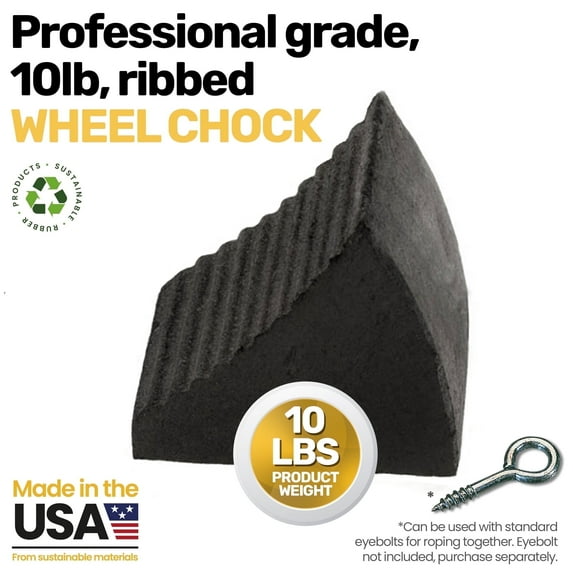 These heavy-duty rubber wheel chocks are designed to provide maximum security and safety for a wide range of vehicles, including trucks, SUVs, campers, boat trailers, and more. Crafted from recycled tire rubber, they are built to withstand extreme temperatures and resist cracking, drying out, or damage from road salt. The ribbed surface ensures a secure grip, while the wedge shape and downward pressure from the wheels help lock the chocks in place, keeping your vehicle securely parked or stored. This product can be used with standard screw-in eyebolts allowing you to easily move or store the chocks. Eyebolts not included, purchase separately. These eco-friendly chocks offer a practical and reliable solution for all your vehicle needs.