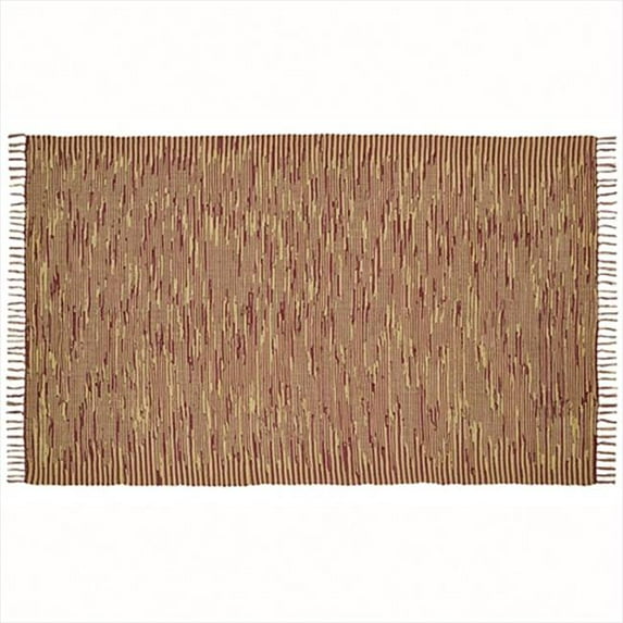 This dark red and tan rug is made with strips of ragged edge 100% cotton for a soft but sturdy floor covering. It measures 60"X96". Please spot clean only.