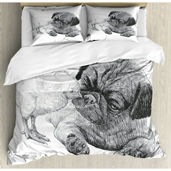 Hero image 0 of Pug Duvet Cover Set Queen Size, Picture of a Pug and Little Chick Drawn by Hand Love Affection Between Animals, Decorative 3 Piece Bedding Set with 2 Pillow Shams, Charcoal Grey White, by Ambesonne, 0 of 3