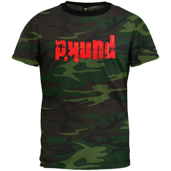 The title card logo from MTV's Punk'd is printed upside-down (get it?) on the front of this green camo ringer tee. 100% cotton.