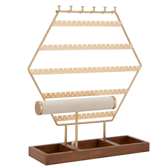 Gold and jewelry organizer stand is the easiest, prettiest way to organize your jewelry. Functional jewelry holder organizer can clean up your dresser and save space for you. The special hexagon shape design and luxury gold color makes this earring holder elegant and unique. Made by wood and metal, the sturdy and stylish earring organizer stand suits any room decor.
