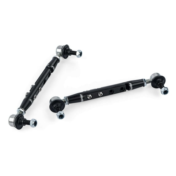 APR's Roll-Control Front Stabilizer Bar End Links improve handling and response through the use of replaceable and swappable ball joints, intended for street use. The end links offer a great range of adjustability in both connection geometry and height, allowing elimination of pre-loading and correction of stabilizer bar geometry. This is a necessary upgrade when altering the factory suspension components to allow correct operation and maximum performance.;