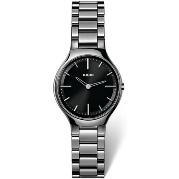 Rado True Thinline Black Dial Ceramic Ladies Watch R27956152. 30 mm gunmetal tone ceramic case with a black dial and a scratch resistant sapphire crystal. Silver tone hands and index hour markers. Minute markers around the outer rim. Logo beneath the 12 o'clock position. Hands: hours and minutes. Case thickness of 5 mm. Push / pull crown. 15 mm gunmetal tone ceramic bracelet with a deployment clasp. Quartz movement and water resistant up to 30 meters. Style: casual watches. True Thinline series.