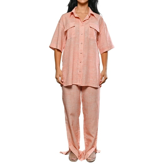 Hero image 0 of Rdhnmea Women Ric Rac Pattern 2 Piece Pajama Set Short Sleeve Button Down Shirt Blouse Satin Wide Leg Lounge Pants Soft Sleepwear, 0 of 9
