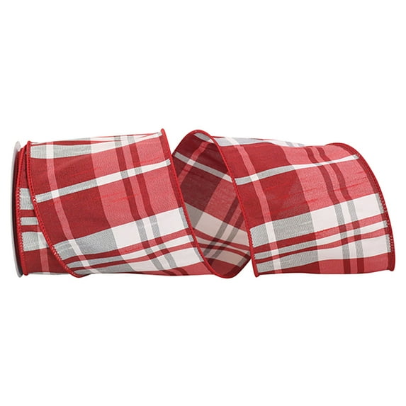 Reliant Ribbon - 93506W-979-10F, Grand Dupione Plaid Base Wired Edge Ribbon, Red/silver, 4 Inch, 10 Yards