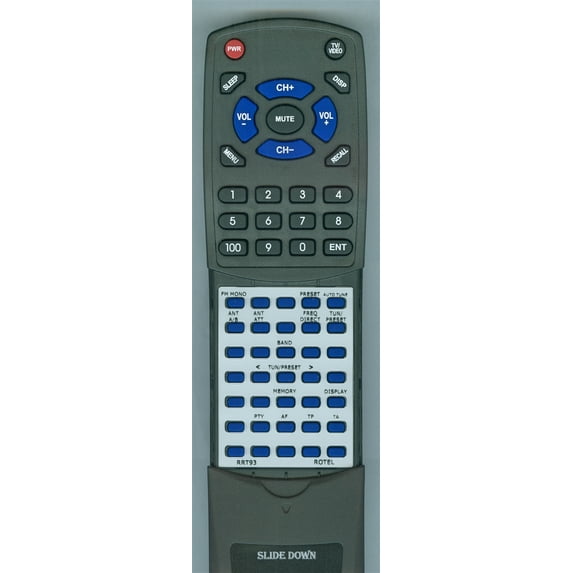 *This is NOT an original ROTEL Remote Control.* It is a custom replacement remote made by Redi-Remote* This remote control is specifically designed to be compatible with the following models of ROTEL units: RR-T93, RRT93 *If you have any concerns with the remote after purchase, please contact me directly*. There is a cover over the lower half of the remote. This will slide down to reveal the lower half, model specific functions.