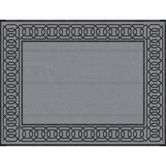 reversible outdoor rug is an excellent choice for creating a comfortable and inviting outdoor environment. this 9' x 12' floor mat is made of waterproof plastic, ensuring that it dry and clean in any weather. it's perfect for use in backyard, on deck, at campsite, or on beach. reversible pattern gives you option to change look of your space, adding a touch of variety. rug is easy to maintain - just wipe it with a damp cloth or rinse it with water. reinforced edges provide added durability, and four corner loop straps keep it securely in place. black and gray border gives it a sophisticated and stylish look. : reversible outdoor rug, waterproof and comfortable, outdoor environment, backyard, deck, campsite, beach, reversible pattern, easy maintenance, reinforced edges, corner loop straps, black & gray border, sophisticated and stylish