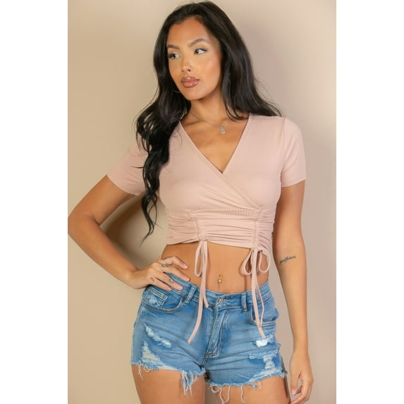 Ribbed Ruched Drawstring Surplice Top
