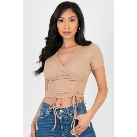 Hero image 0 of Ribbed Ruched Drawstring Surplice Top, 0 of 2