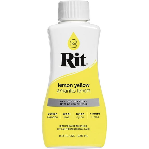 Rit Dye Liquid Dye in lemon yellow dyes clothing and accessories, rejuvenates old garments, coordinates home decor, hides laundry accidents and more. 3 Pack Rit Liquid Dye.