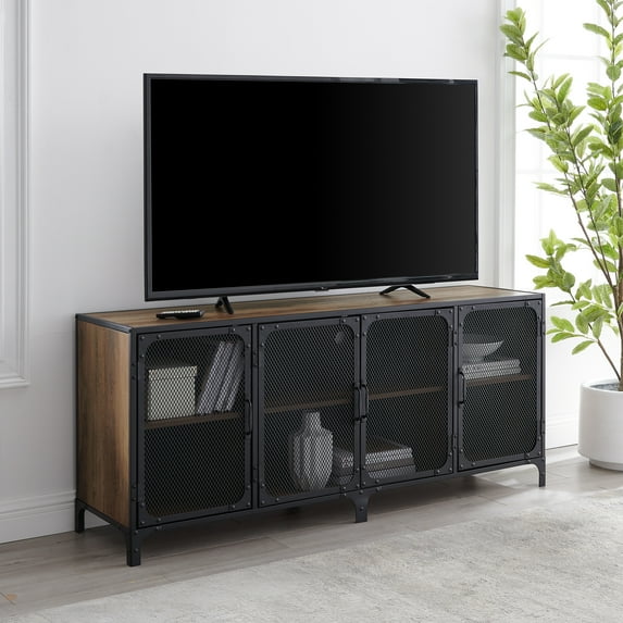 - This urban industrial entertainment center can accommodate TVs up to 66-inches.