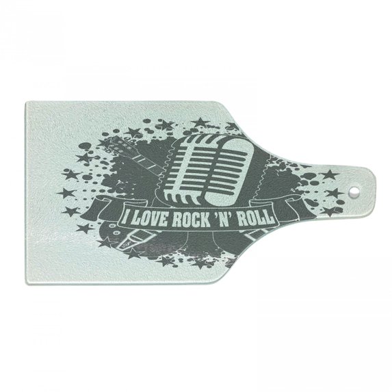 Rock Music Cutting Board, Monochrome Microphone Retro Style Guitars Stars and Dots Illustration Abstract, Tempered Glass Cutting and Serving Board, Wine Bottle Shape, Grey White, by AmbesonneRock Music Cutting Board Monochrome Microphone Retro Style Guitars Stars Dots Illustration Abstract Tempered Glass Serving Wine Bottle Shape Grey WhiRock Music Cutting Board Monochrome Microphone Retro Style Guitars Stars Dots Illustration Abstract Decorative Tempered Glass Serving Small Size GreyRock Music Cutting Board Monochrome Microphone Retro Style Guitars Stars Dots Illustration Abstract Decorative Tempered Glass Cutting Serving Board L