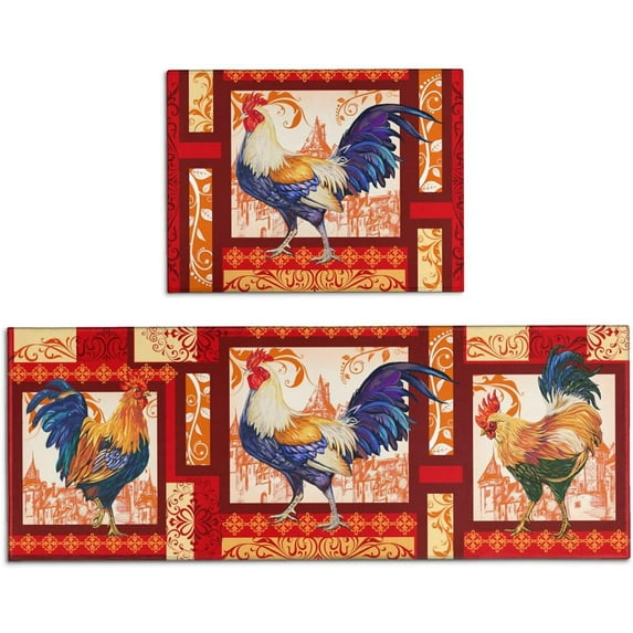 - KITCHEN MAT SET OF 2: The rooster kitchen rug set 2 piece measures approx - 17*30 and 17*48inch. Provide a comfortable large space to stand. Suitable as rooster kitchen decor, chicken kitchen decor, rooster rugs, small rooster rug, rooster and chicken kitchen decor, red kitchen rugs farmhouse style, kitchen rooster decorations, rug for kitchen sink area, red kitchen mats, farmhouse floor mat, chicken rugs for kitchen