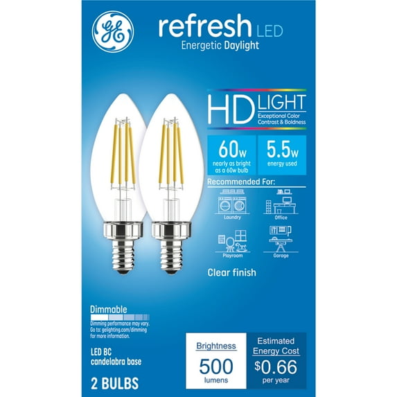 64.8 out of 5 Stars. 6 reviewsShipping, arrives in 3+ daysGE 31425 Refresh HD Decorative LED Light Bulbs, Candelabra Base, Daylight, Clear, 300 Lumens, 4 Watt, 2-Pk. - Quantity 1 $10.58 Was $32.09