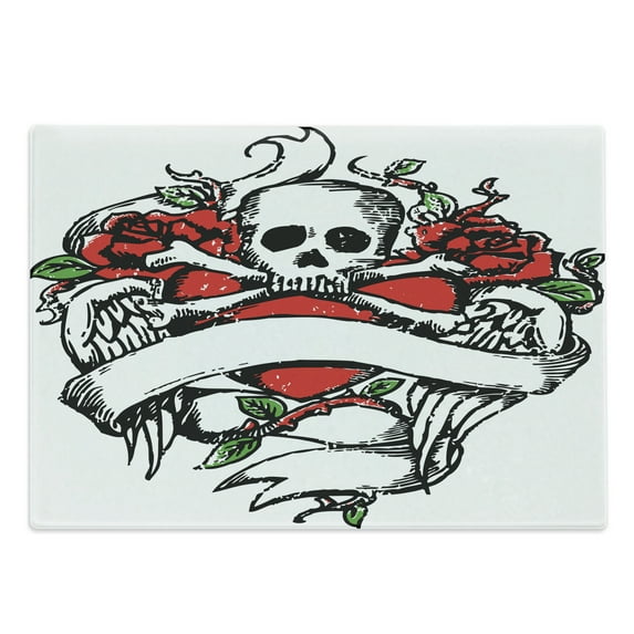 Rose Cutting Board, Sketchy Revival Skull Big Red Heart Crossed Bones Wings and Leaves, Decorative Tempered Glass Cutting and Serving Board, Large Size, Black Vermilion Green, by AmbesonneRose Cutting Board Sketchy Revival Skull Big Red Heart Crossed Bones Wings Leaves Decorative Tempered Glass Serving Large Size Black Vermilion GreenRose Cutting Board Sketchy Revival Skull Big Red Heart Crossed Bones Wings Leaves Decorative Tempered Glass Serving Small Size Black Vermilion Green