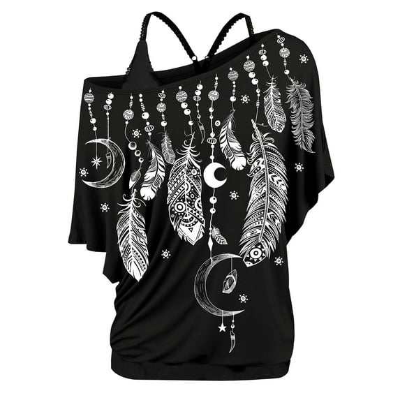 Rosegal Women's Plus Size Skew Neck Feather Print T-shirt and Cami Top Twinset