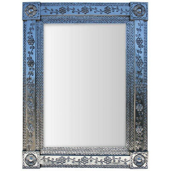 Royal Silver Tin Mirror. This mirror is finished in silver. It will delight any mission or Southern home decoration, it will be a unique addition to your home accents. It will fit on your hallway, bathroom or dressing area! It has one flower on each corne