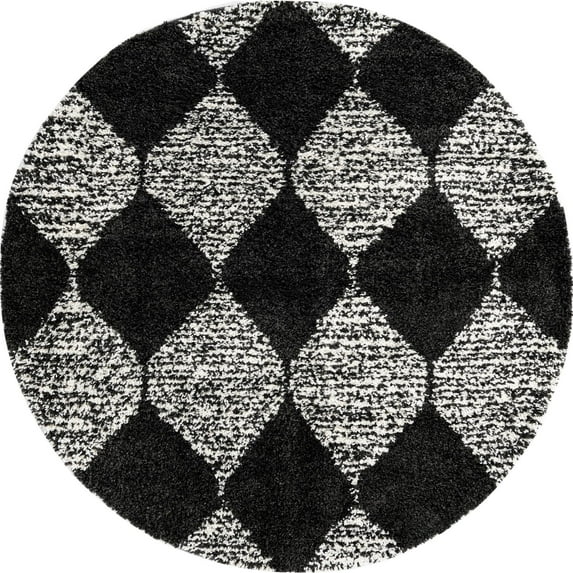Rugs.com Serenity Shag Collection Rug – 7 Ft Round Black And White Shag Rug Perfect For Kitchens, Dining Rooms