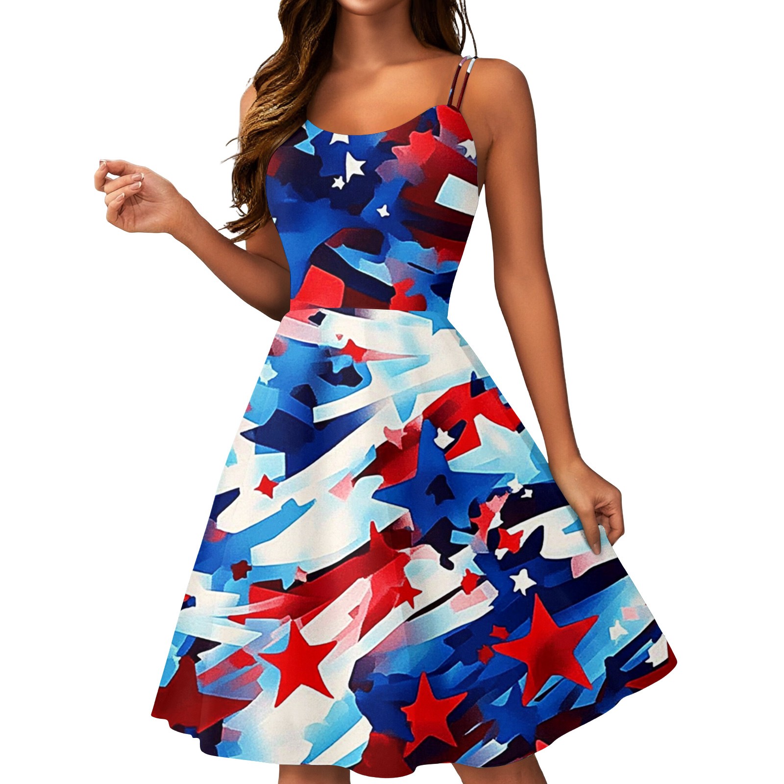 SAATLERI July 4th Dresses for Women Flag Spaghetti Strap Patriotic Dress A Line Sleeveless Casual Cocktail Midi Evening Party Dress