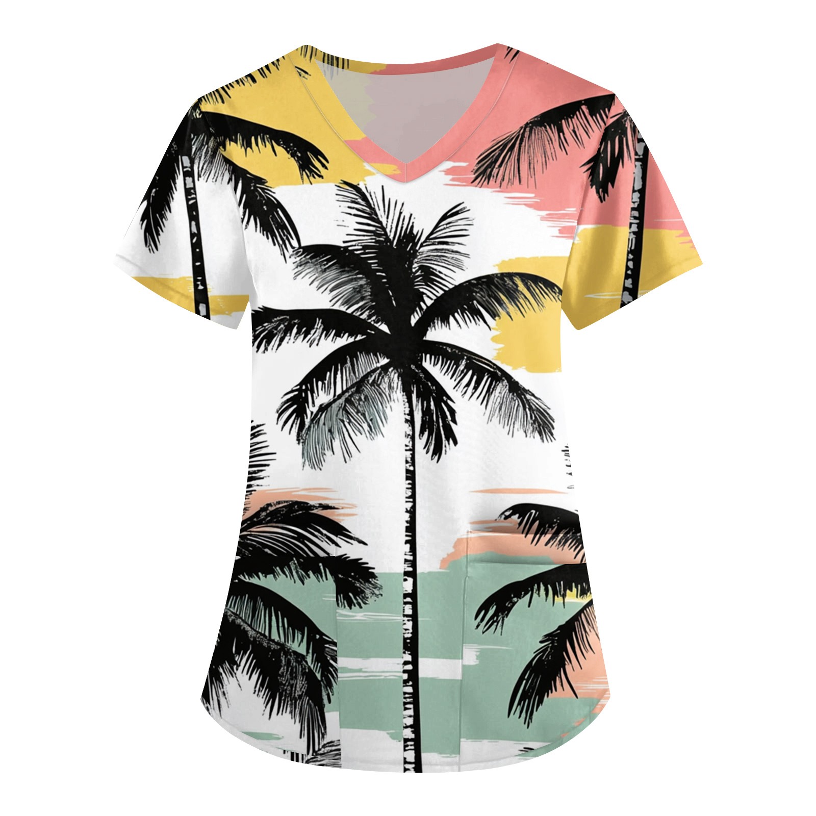 SAATLERI Scrub Tops for Women Print Hawaiian Scrubs Short Sleeve V Neck Floral Printed Comfy Medical Nurse Shirts Workwear with Pockets