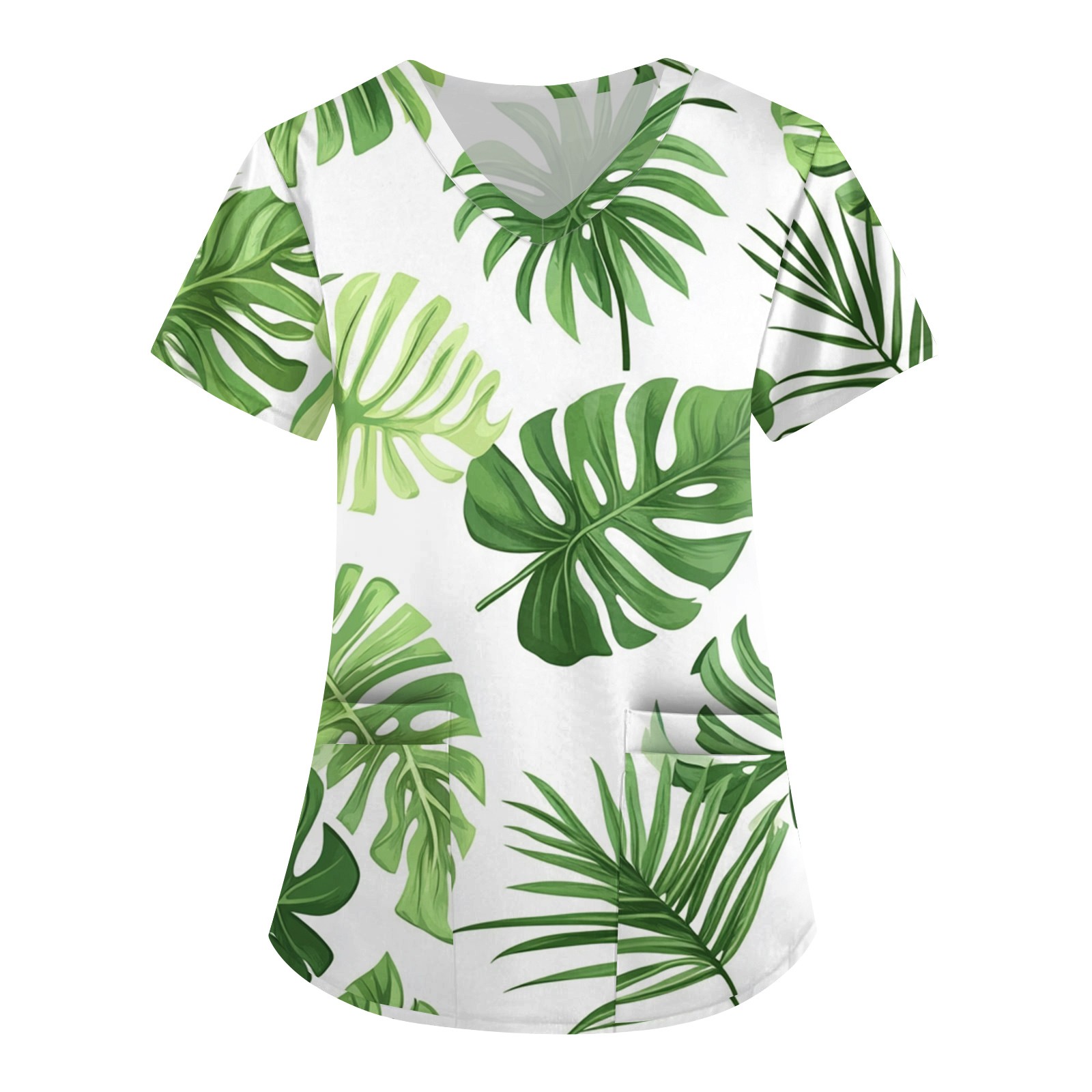 SAATLERI Scrub Tops for Women Print Hawaiian Scrubs Short Sleeve V Neck Floral Printed Comfy Medical Nurse Shirts Workwear with Pockets