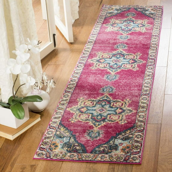 SAFAVIEH Merlot Collection MER108R Fuchsia / Multi Rug Ornate traditional motifs are distressed and modernized by illuminating color-ways in SAFAVIEH�s Merlot Collection. These area rugs are full of character and bohemian flair that are guaranteed to brighten and liven up any living space. A low pile height allows for a range of decorating options, and its power-loomed construction ensures a sturdy foundation. Rug has an approximate thickness of 0.25 inches.
