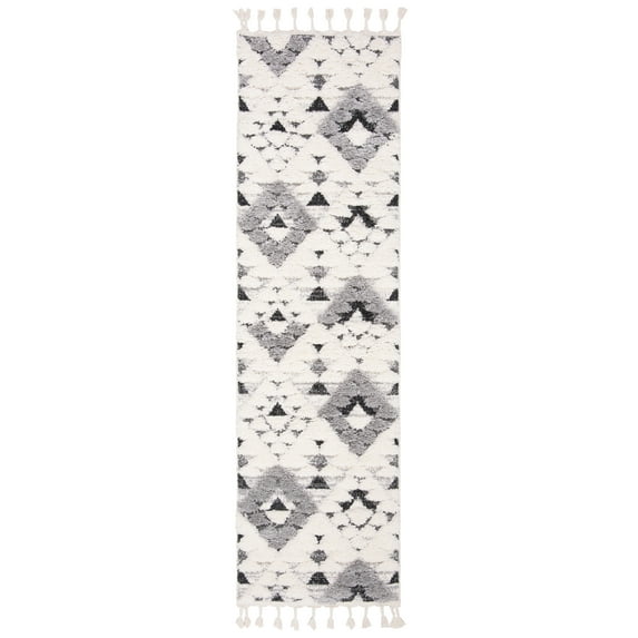 SAFAVIEH Moroccan Tassel Larry Geometric Shag Runner Rug, Ivory/Grey, 2'3" x 14'