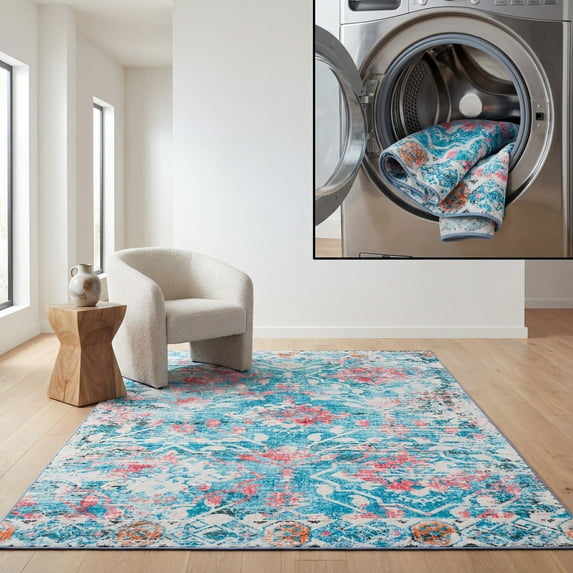 Hero image 0 of SAFAVIEH Riviera Dzvezda Abstract Polyester Machine Washable Area Rug, Light Blue/Pink, 9' x 12', 0 of 13