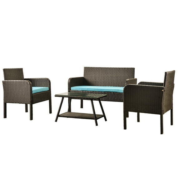 The SEGMART 4-piece patio furniture sets is crafted from plastic wicker and iron frame, it is designed to stand up to sunshine beating down and rainstorms rolling through. This four-piece sofa set, including a loveseat, two armchairs, thick Cushions and a coffee table. Enjoy cocktails and conversation by the pool or dessert under the stars at your next alfresco gathering with your friends and families! Don't hesitate to buy it !!!