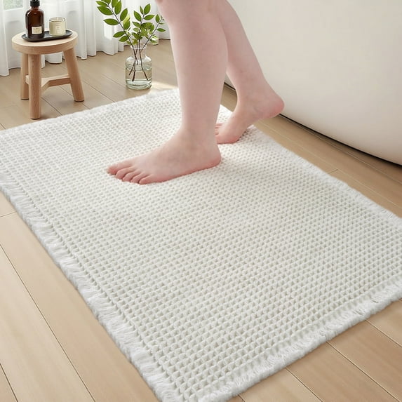 SIXHOME Bathroom Rugs Waffle Bath Rug Super Soft Absorbent Non Slip Bath Mat Beside Tub Rubber Backed Machine Washable Bathroom Rugs with Tassels Boho Bathroom Decor 20" x 32" White