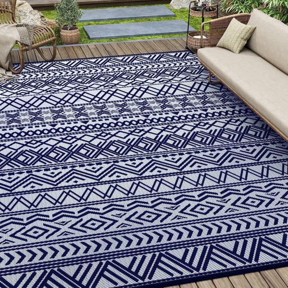 Hero image 0 of SIXHOME Outdoor Rug 8'x10' Waterproof Reversible Patio Rug Boho Geometric Indoor Outdoor Rugs Lightweight Plastic Straw Ourdoor Carpet for RV Camping Deck Balcony Modern Porch Decor Blue and White, 0 of 7