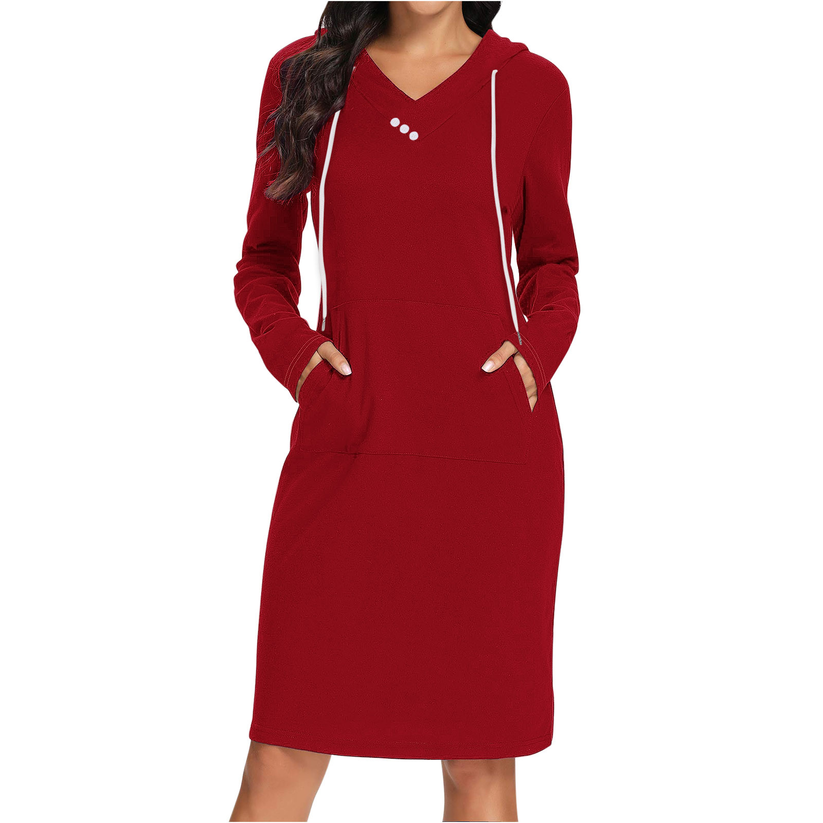 SMihono Fashion Long Sleeve Dress for Women Lightweight V Neck Kangaroo Pocket Hoodie Dress Spring Sweatshirts for Women Red 10